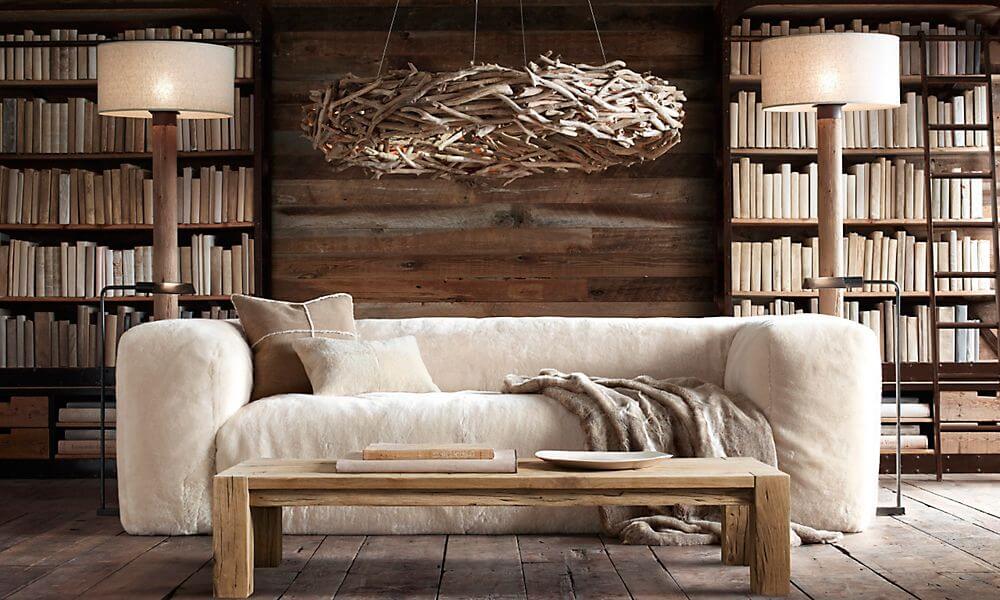What is cozier than this living room picture from Restoration Hardware. I think this is the Fulham sofa with an amazing sherpa/faux fur cover. The driftwood chandelier is just the right amount of “rustic” to balance the softness of that smushy, cozy sofa.