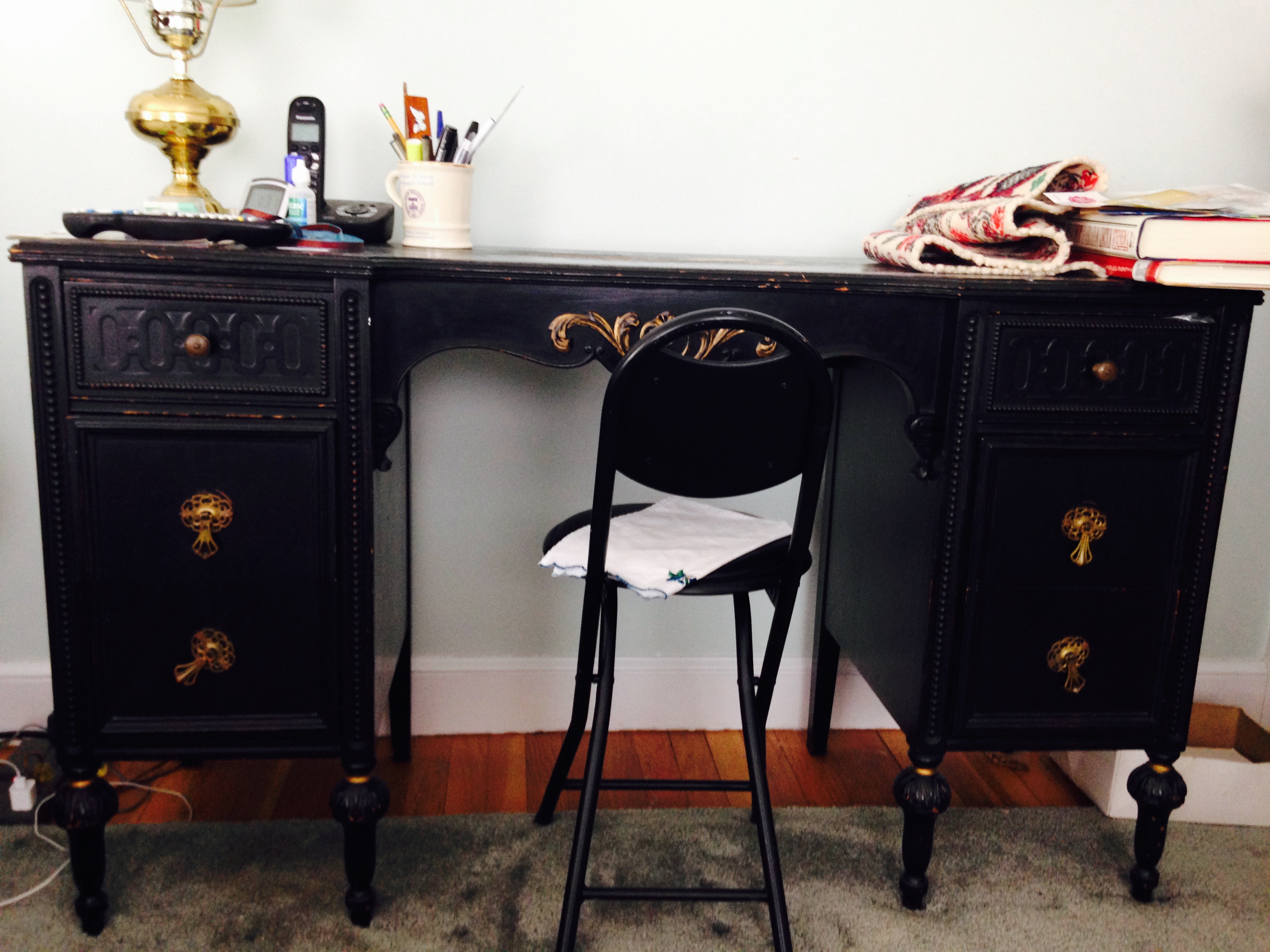 I have recently received a beautiful old desk with graceful lines. It’s painted black, and desperately in need of a new paint job.