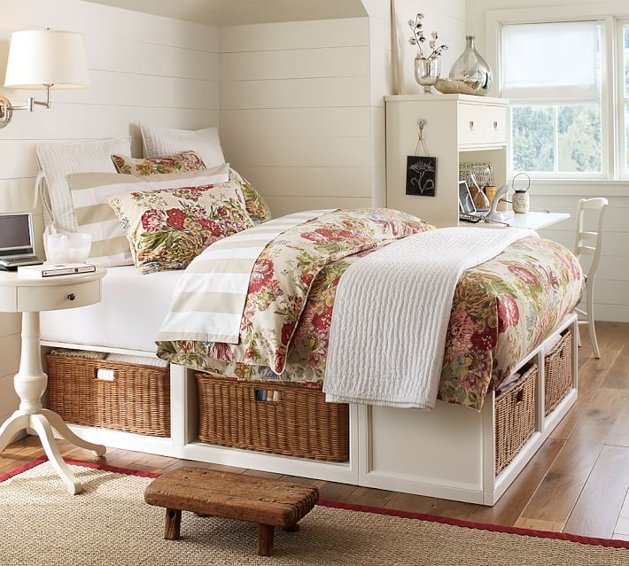 Bedrooms can definitely be the messiest room of the house. With clothes and shoes being thrown around, it may feel like your smaller bedroom is never tidy. Under-the-bed storage is key here- and this one from Pottery Barn has tons of it! I love how there are baskets not only on the sides, but even the front…bonus bins!
